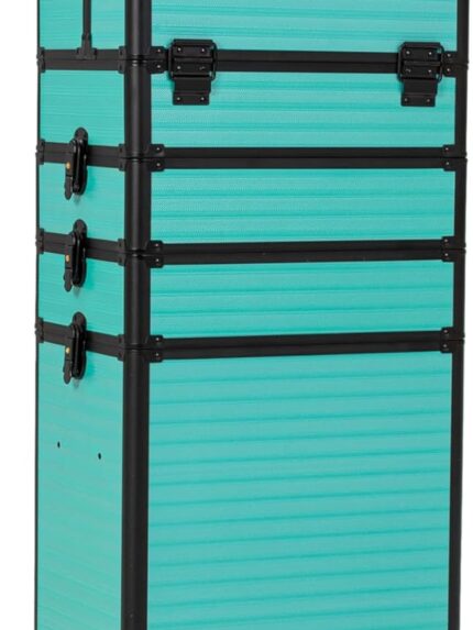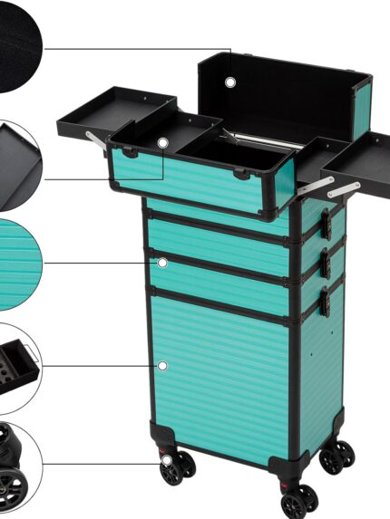 4 in 1 Portable Traveling Aluminum Professional Makeup Trolley Cart with Multiple-Sized Compartments and Wheels (Black with Azure)
