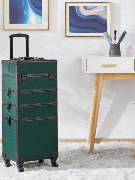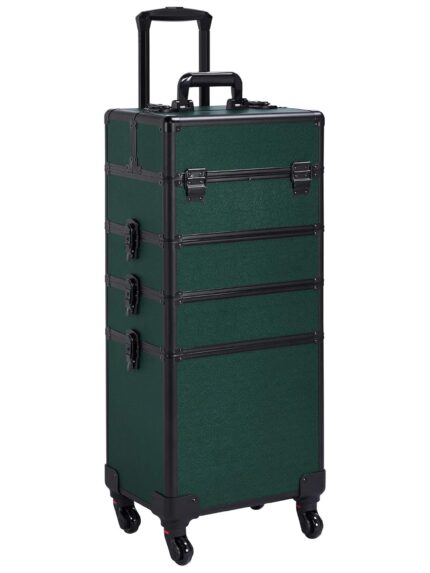 4 in 1 Aluminum Rolling Makeup Case Professional Cosmetic Case Makeup Train Case Cosmetic Organizer Makeup Trolley Dark Green