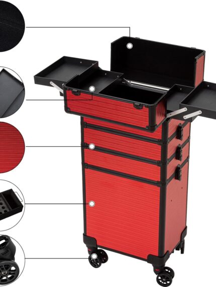 4 in 1 Portable Traveling Aluminum Professional Makeup Trolley Cart with Multiple-Sized Compartments and Wheels (Black with red)