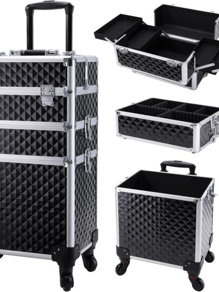 4 in 1 Makeup Rolling Train Case Aluminum Trolley Professional Cosmetic Organizer Box with Shoulder Straps 2 Keys Black(Cosmetic are not included)