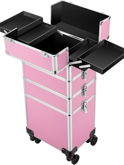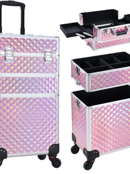 3 in 1 Rolling Makeup Train Case Portable Cosmetic Trolley Large Storage for Professional with 360° Swivel Wheels Salon Barber Case Traveling Cart TrunkGlitter Pink
