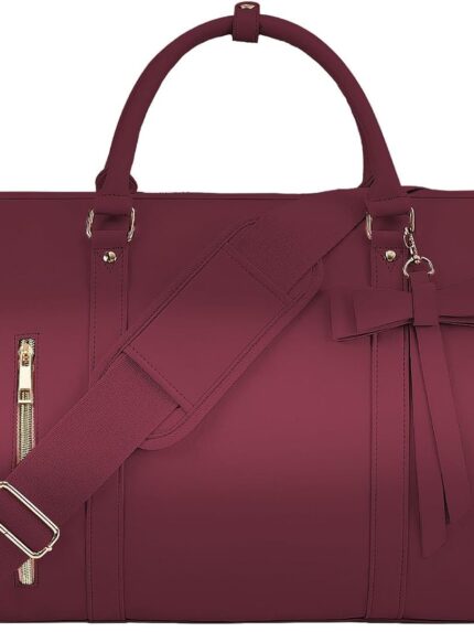 Garment Bags for Travel, Convertible Suit Travel Bag for Women, Stylish Carry On Garment Bag with Toiletry Pocket, Shoulder Strap and Shoes Compartment, 2 in 1 Foldable PU Leather Duffle Bag, Sangria