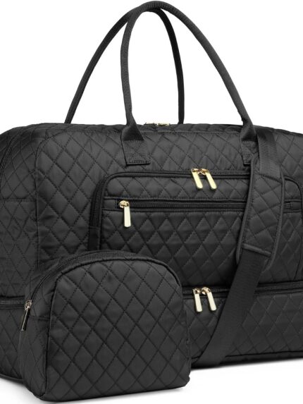 Large Women Travel Duffle Bag – Carry on Overnight Bag Weekend Travel Duffel Tote Bag Yoga Gym Bag with Wet Pocket Toiletry Weekender Overnight Bag for Travel Business Trips Sport Hospital Black