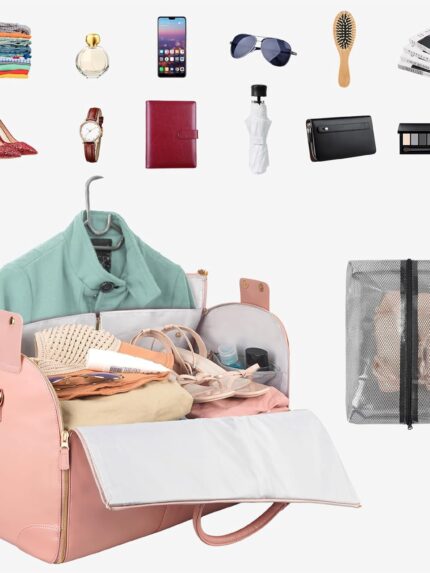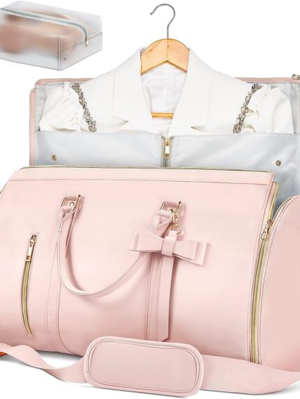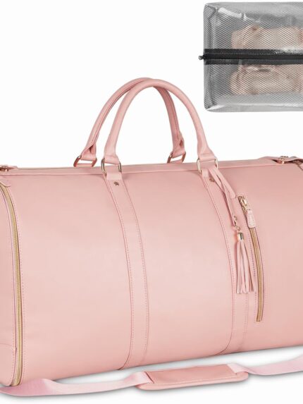Garment Bags for Travel, Convertible Suit Travel Bag for Women, Stylish Carry On Garment Bag with Toiletry Pocket, Shoulder Strap and Shoes Compartment, 2 in 1 Foldable PU Leather Duffle Bag, Pink
