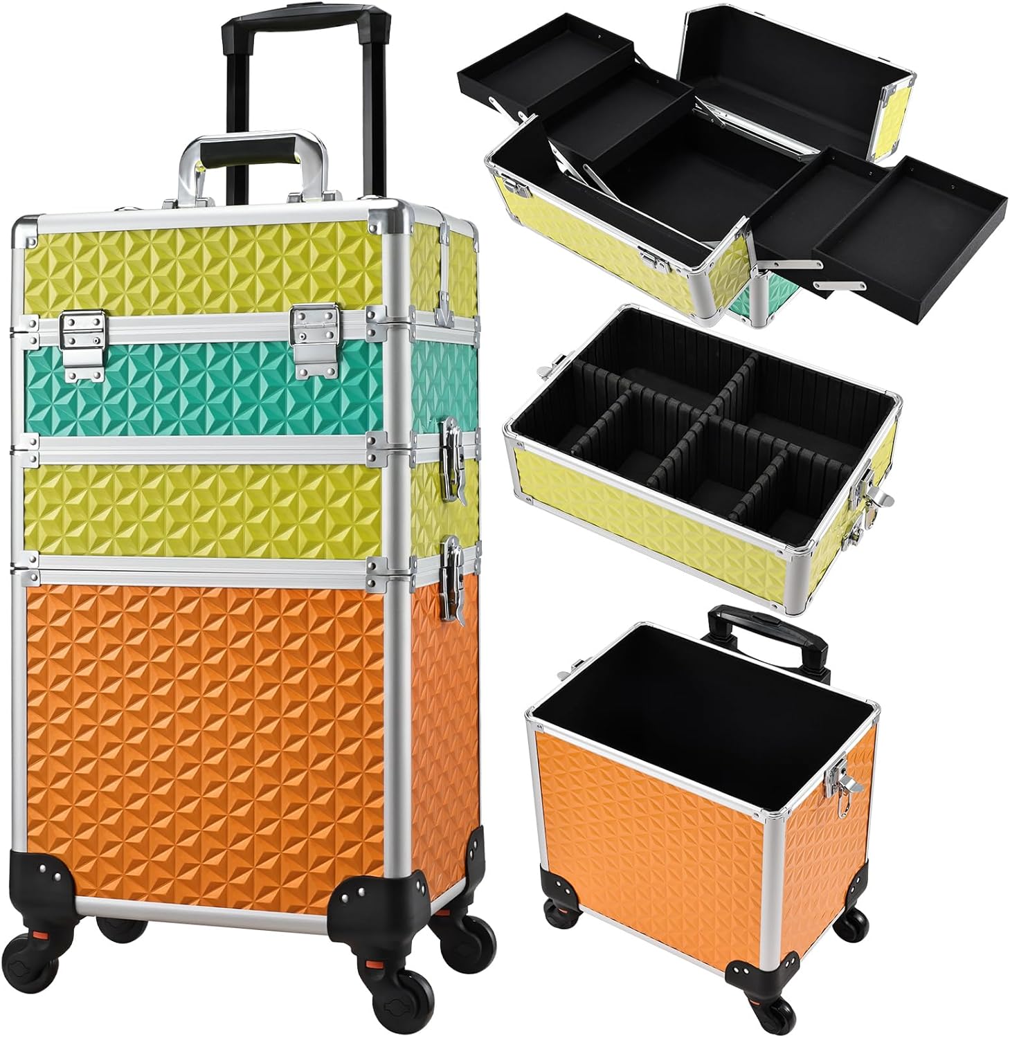 3 IN 1 Rolling Makeup Case Cosmetology Case on Wheels Nail Case Storage Organizer Salon Barber Case Traveling Trolley Cart for Nail Tech Mobile Hairstylists Makeup Trunk Tricolor