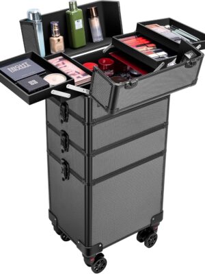 Professional Rolling Case – The multi-functional rolling makeup case with pull-out trays and a drawer is designed to meet the