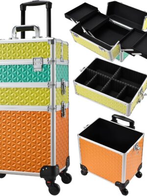 3 IN 1 Rolling Makeup Case Cosmetology Case on Wheels Nail Case Storage Organizer Salon Barber Case Traveling Trolley Cart for Nail Tech Mobile Hairstylists Makeup Trunk Tricolor