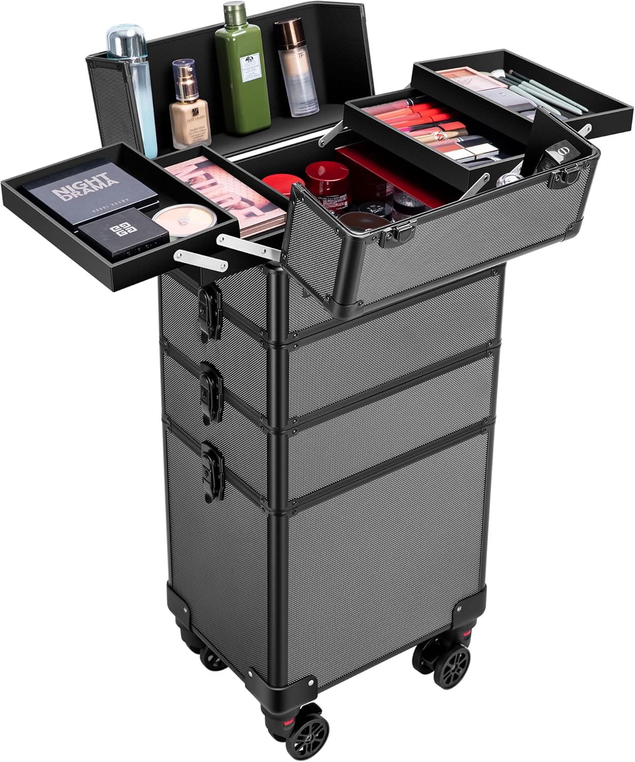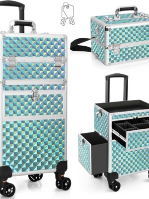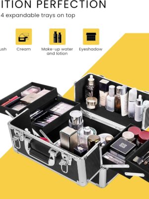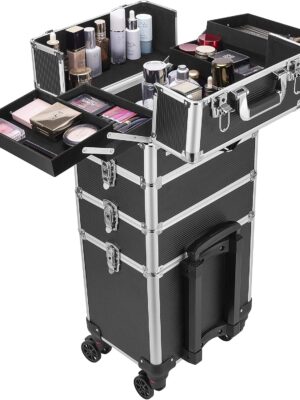 - ULTIMATE CAPACITY – With a loading capacity of 66 lbs. and a dimension of 13.4″(L) x 10″(W) x 28.3″(H), this makeup case on rollers allows you to store a lot of cosmetics and makeup tools like makeup brush set, spray bottles, and hair dryers; There are 4 extendable trays in the top case to offer more storage spaces; Large storage space at the bottom layer with no divider allows you to store makeup tools of large sizes