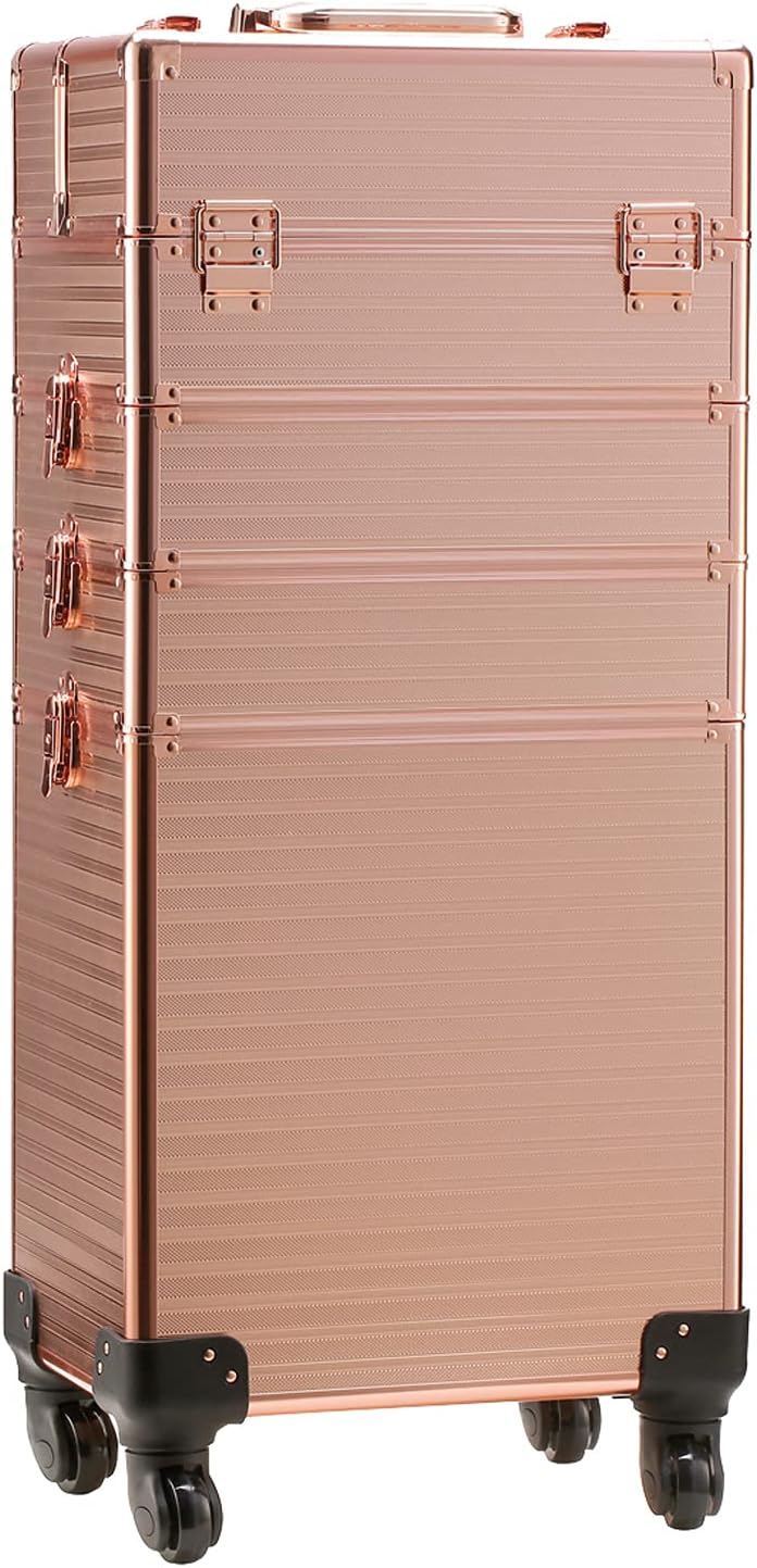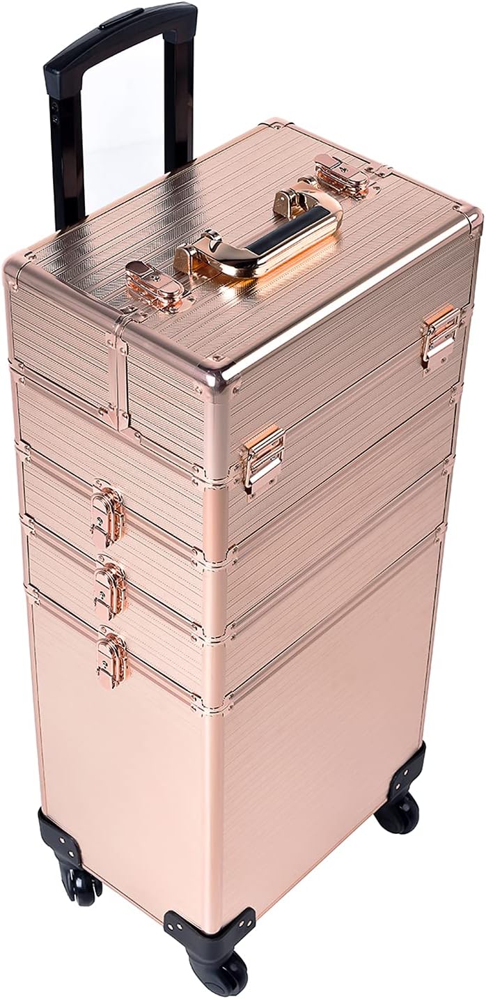 4 in 1 Portable Traveling Aluminum Professional Makeup Trolley Cart with Multiple-Sized Compartments and Wheels, Rose Gold