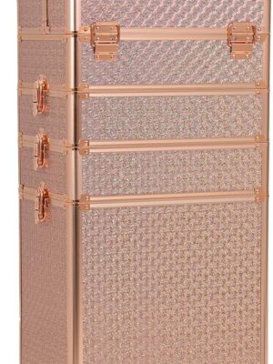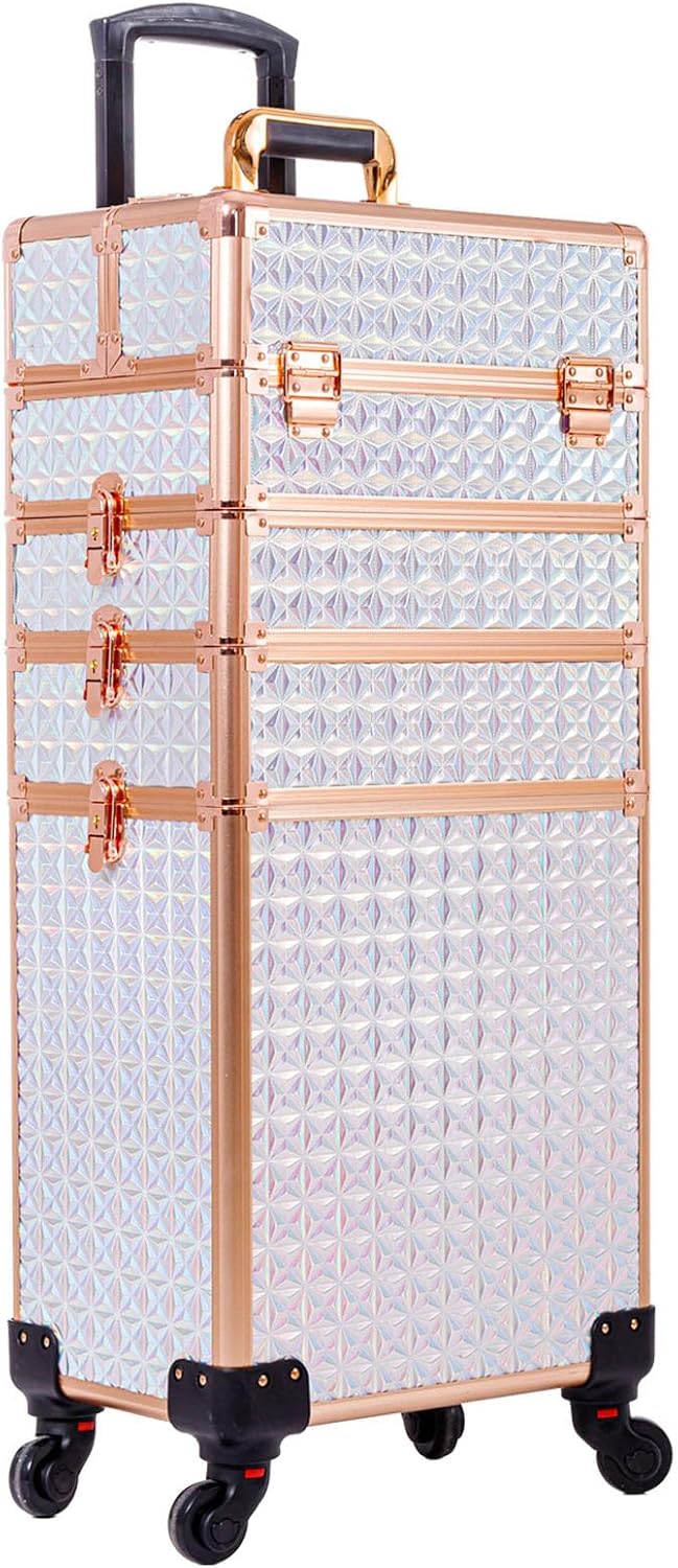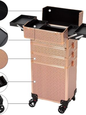 4 in 1 Portable Traveling Aluminum Professional Makeup Trolley Cart with Multiple-Sized Compartments and Wheels (baby’s breath gold)