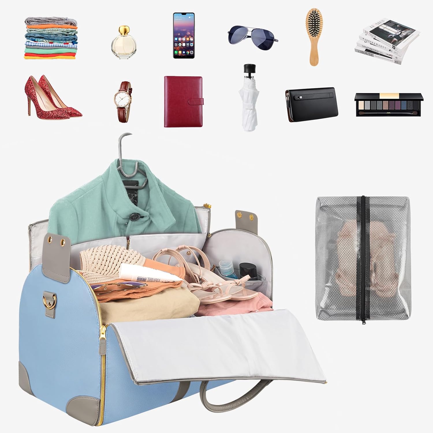 Garment Duffle Bags for Travel, Convertible Travel Garment Bag with Shoulder Strap, Large Carry on Garment Bag Weekender Bag for Women with Shoe Pouch, 2 in 1 Hanging Suitcase Travel Bags, Blue