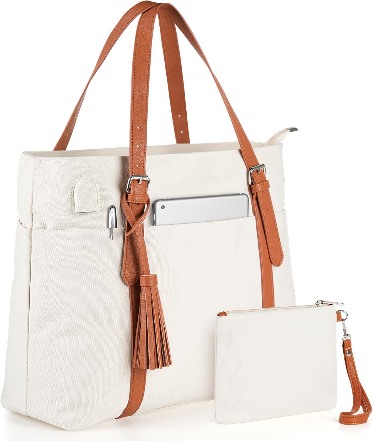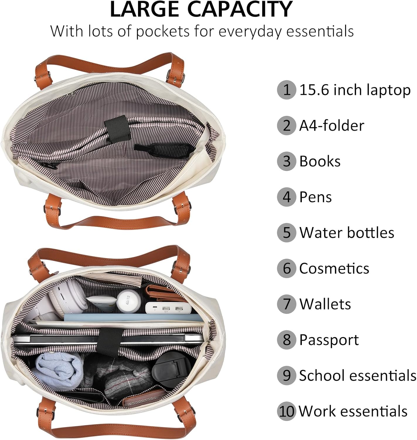 Women Laptop Tote Bag for Work Travel,Teacher Nurse Bag with Zipper Compartments,Cute School Bookbag for College Church,Canvas,Gifts,Beige Khaki